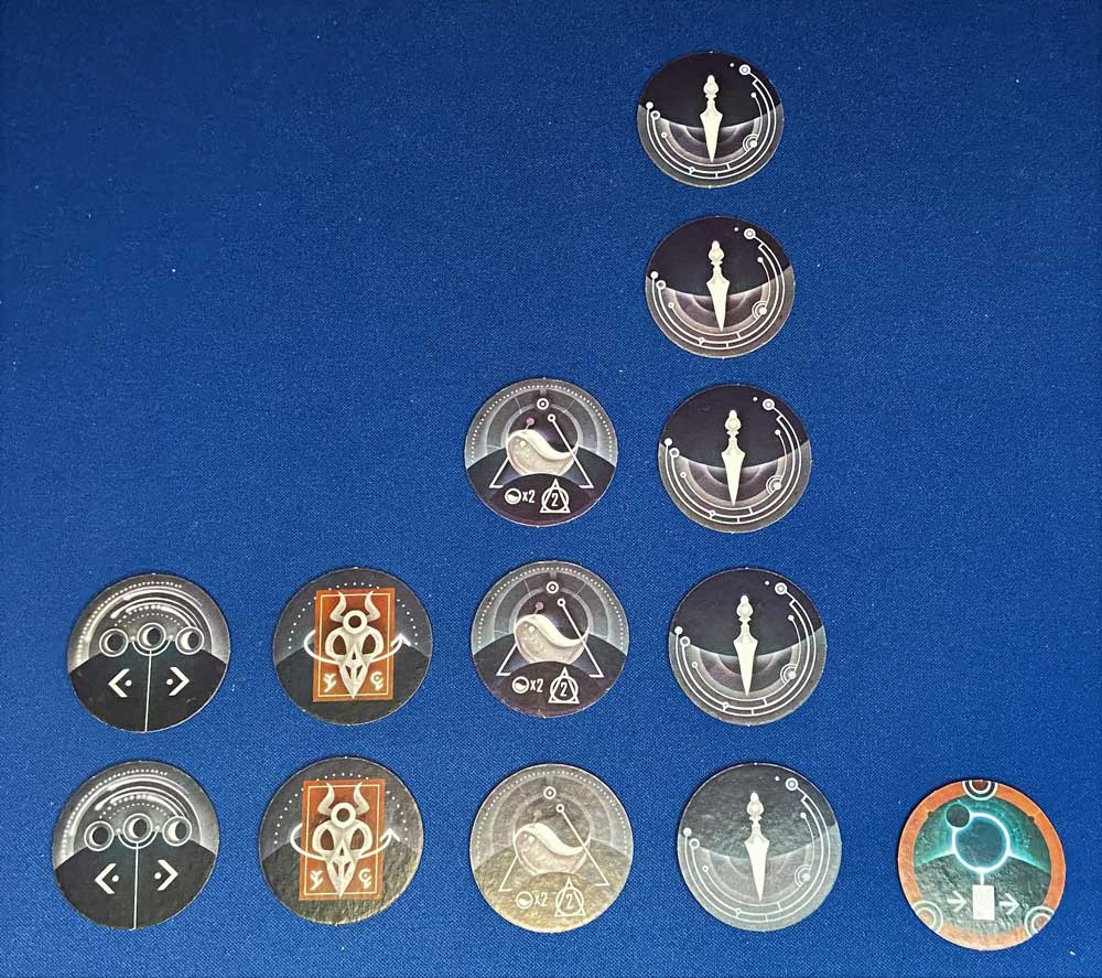 - Mezcla las 12 losetas de artefacto y muestra las dos primeras sobre el tablero. Con las 10 losetas restantes introduce de forma aleatoria la loseta de eclipse, recuerda que esta loseta tiene dos lados que son válidos. La loseta de eclipse no puede quedar la primera, por lo que si esto ocurre, vuelve a mezclar.