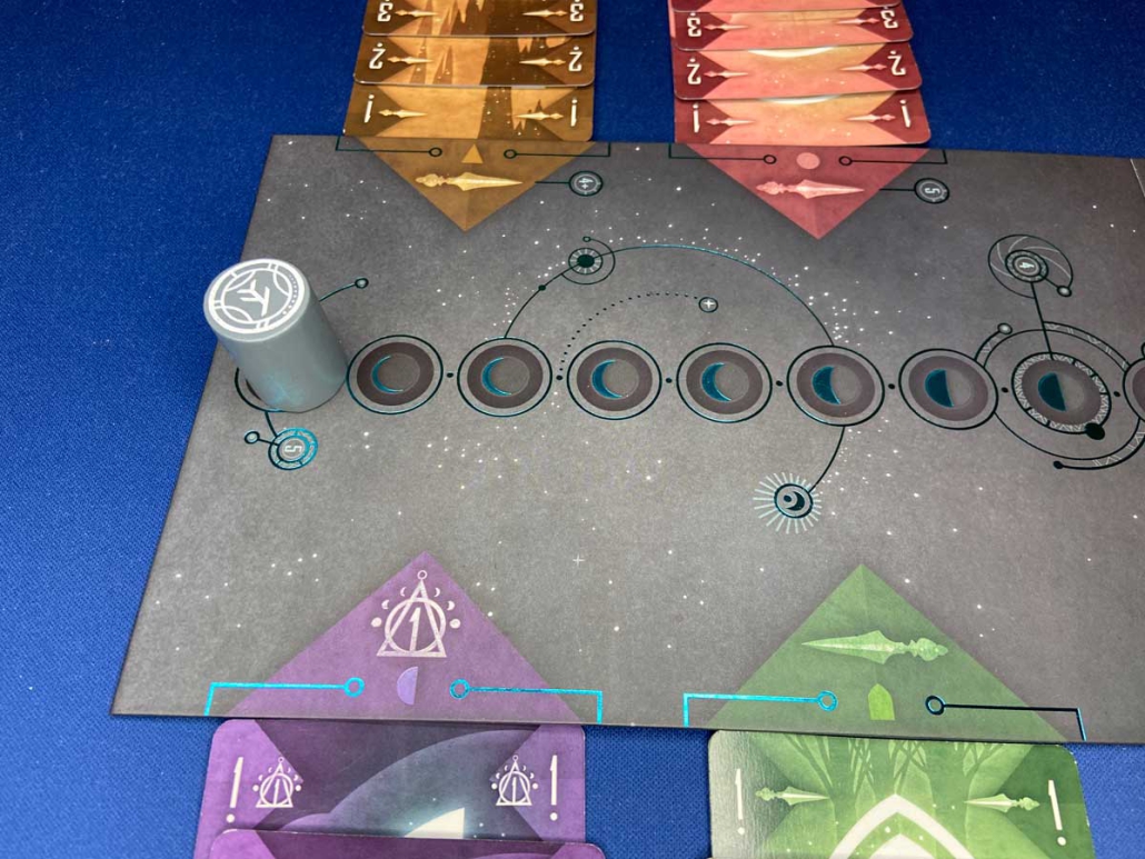 Si la carta jugada coincide con el mismo color que jugó el guía, la carta será resuelta después con el resto de las cartas del mismo color. Si la carta no coincide con el color que jugó el guía, has de mover el peón de las sombras un espacio hacia la luna y esta carta debe se colocada inmediatamente en su mundo. Si esta fuera la ultima carta de este mundo, se debe ejecutar el ritual de ese mundo de forma inmediata, mas tarde hablaremos de esto. Es importante decir, que, a diferencia de otros juegos de bazas, nadie está obligado a seguir el color del guía, esto es importante porque las sombras tienen su interés particular.