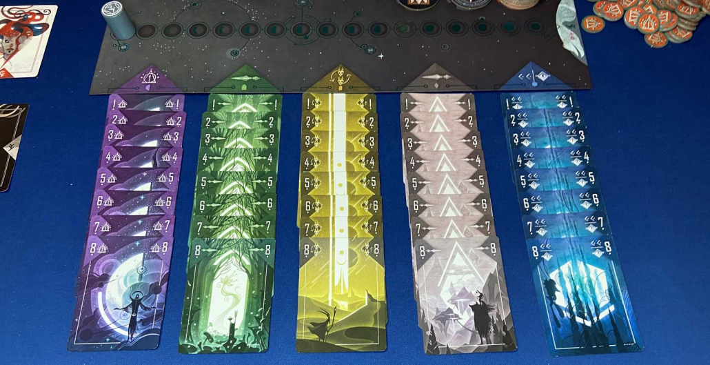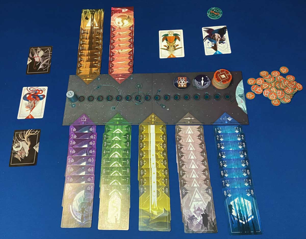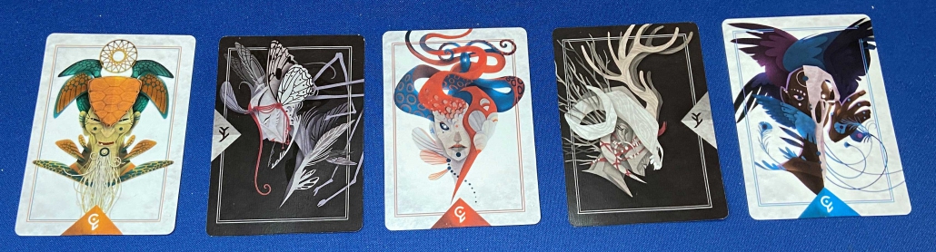 En partidas con 5 jugadores, utilizaremos 3 cartas de Chaman y 2 carta de Sombra, todas las cartas de rol. Usaremos todos los colores de cartas, morado, verde, amarillo, gris, azul, marrón y rojo, el rojo está marcado en el tablero con el número 4, además usaremos todos los números, del 1 al 8.
